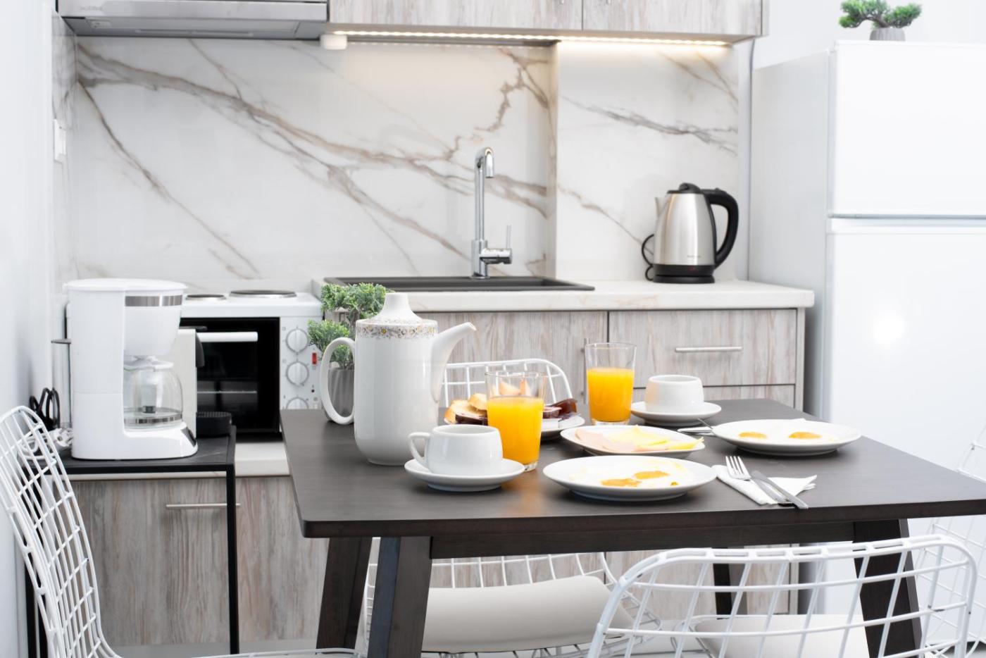 Deluxe Studio. Meals can be prepared in the kitchenette, which has a stovetop, a refrigerator, kitchenware and an oven. This air-conditioned studio is comprised of a flat-screen TV with satellite channels, a private bathroom as well as a terrace with a quiet street view. The unit has 2 beds. ;