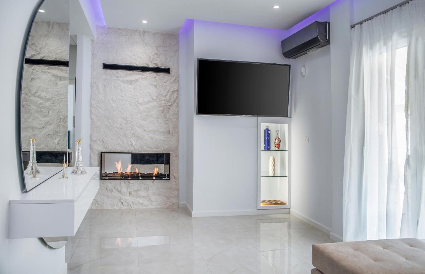 Two-Bedroom Apartment. The fireplace is the standout feature of this apartment. Boasting a private entrance, this air-conditioned apartment features 1 living room, 2 separate bedrooms and 1 bathroom with a walk-in shower and a hairdryer. Meals can be prepared in the kitchen, which has a stovetop, a refrigerator, kitchenware and an oven. A seating area with a flat-screen TV, a tea and coffee maker and a terrace are available in this spacious apartment. The unit has 2 beds.