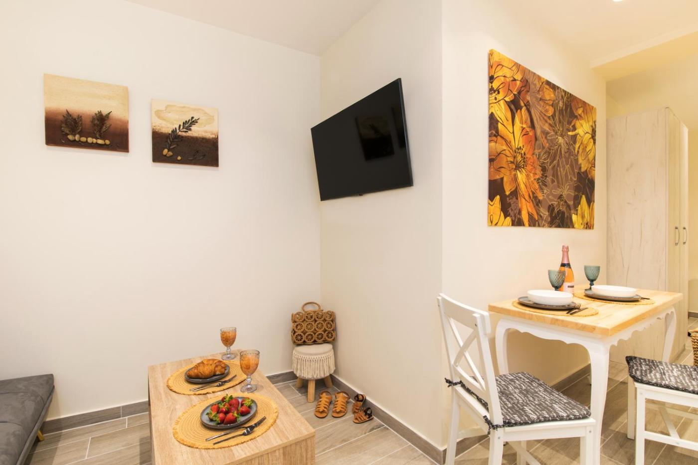 One-Bedroom Apartment. This air-conditioned apartment includes 1 living room, 1 separate bedroom and 1 bathroom with a shower. Meals can be prepared in the well-fitted kitchen, which is fitted with a stovetop, a refrigerator, kitchenware and an electric kettle. This apartment has soundproof walls, flat-screen TV, a quiet street view, as well as fruit for guests. The unit has 2 beds.
