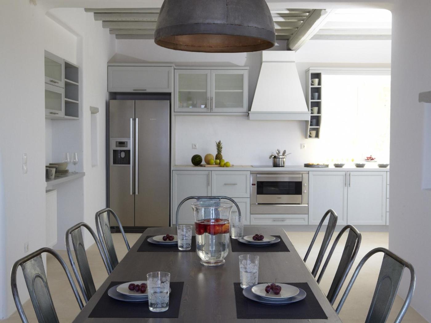 Villa with Private Pool. This villa has a private infinity pool with panoramic views over the Aegean Sea and the island of Tinos. Featuring arched walls, white wooden ceilings and large windows, it consists of 4 bedrooms, 4 bathrooms, a spacious living room, dining area, fully equipped kitchen and outdoor furnished area.