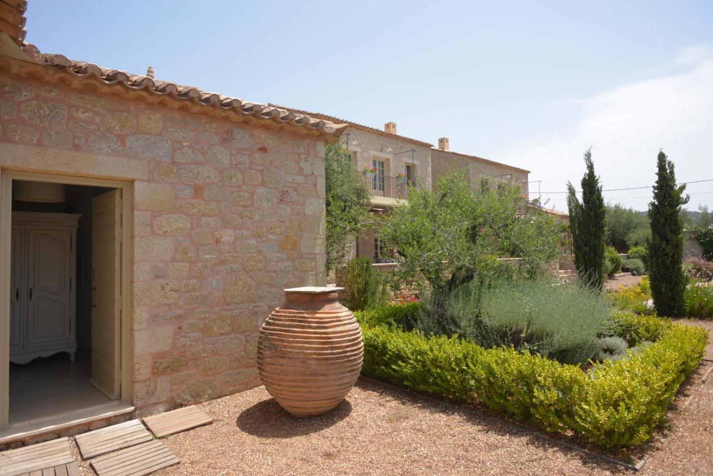 Two-Bedroom Villa. This stone-built, split-level apartment, offering Taygetos mountain views from its balcony, is tastefully decorated with antiques, wooden furnishings and earthy tones. It is air-conditioned and has 2 bedrooms and 2 bathrooms with free toiletries and a hairdryer. The living room comes with a fireplace, iPod docking station, flat-screen TV and DVD player. A well-equipped kitchen and free Wi-Fi are also available. ;