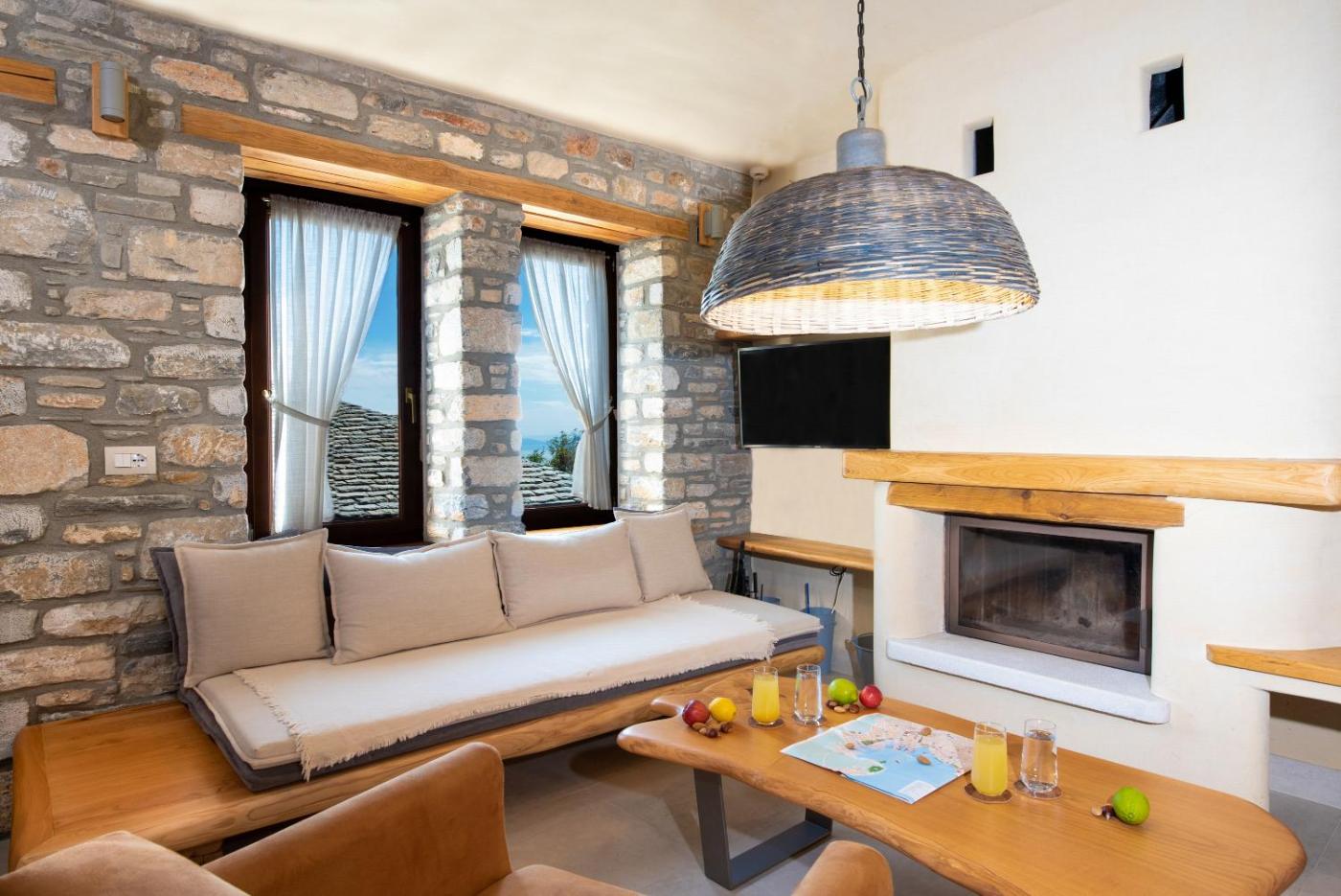 Apartment. The unit consists of 2 floors. On the ground floor there is a living room with kitchenette and WC. The unit has a view of the Pagasetic Gulf from the ground floor and a patio with outdoor furniture. A bedroom with a fireplace is located on the 1st floor. The bathroom has a spa bath. The use of the firewood is subject to extra charges. The unit has capacity for 2 extra persons upon charge. ;